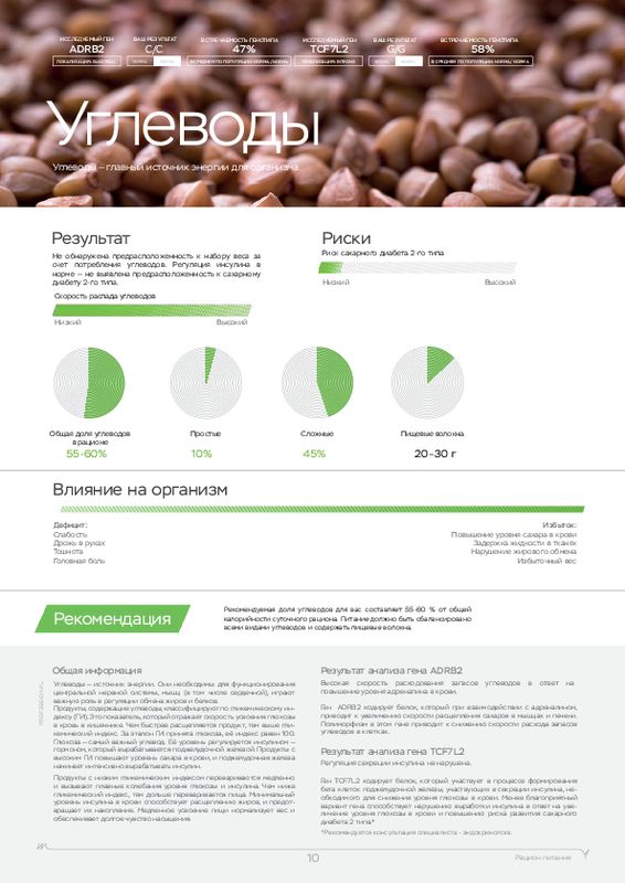 Этот ДНК анализ показывает, к каким физическим нагрузкам человек расположен генетически, а также какие продукты (содержащие определенные элементы) лучше употреблять в пищу. У каждого человека свои цели, кто-то хочет просто сбросить лишний вес, кто-то увеличить силу мышц, а кто-то нарастить огромные мускулы. Для получения максимальной отдачи от тренировок мы рекомендуем пройти наш генетический тест для фитнеса в Нефтекумске.